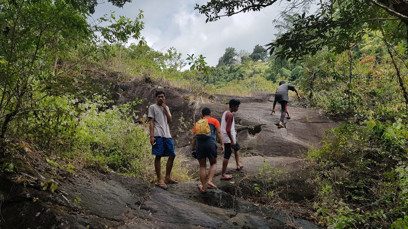 Dari Kuda Sembrani selanjutnya menuju Air Terjun Mangku Kodeq. Rutenya melewati jalan setapak yang ada di bukit sebelah kiri. Meskipun tidak terlalu tinggi, kita harus tetap hati-hati jangan sampai tergelincir ketika melewati pinggir bukit. Kemudian kita juga naik tebing batu dengan bantuan akar-akar pohon.  |